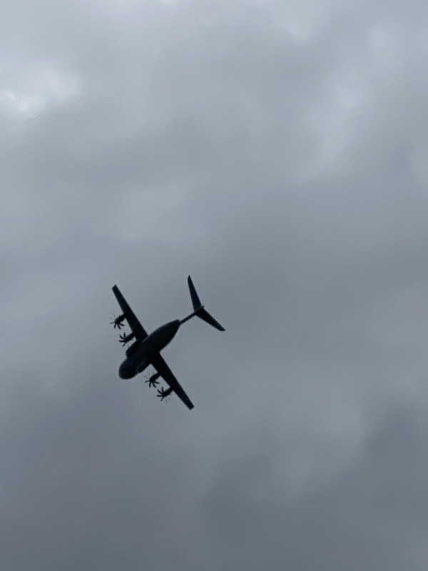 However, where I work in Westbury there’s always aircraft of one sort or another around, sometimes ridiculously low, mostly helicopters, but occasionally big transports like the Airbus A400 that went over the other day; managed to grab a quick photo at 2x zoom on my phone. Shows the multibladed prop blades nicely.
