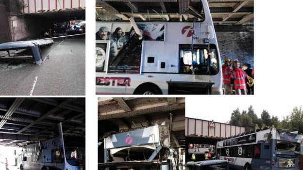 Some div has driven a double decker bus under a single decker bridge near the train station. Probably best to find an alternate route home if this affects you.