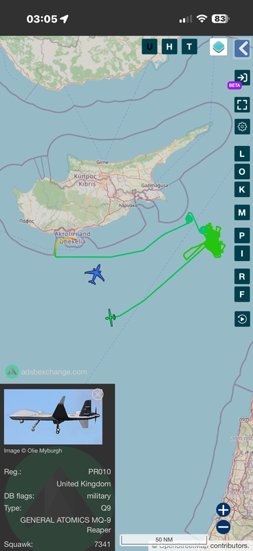 The Reaper is still cruising around over Cyprus, or rather, over the eastern side of the island, with a different Voyager scribbling flight lines all over the place.