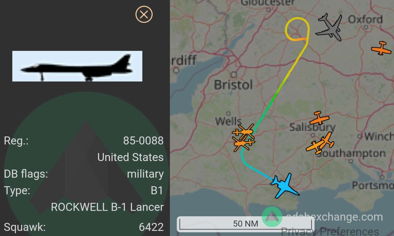 B52 heading into the UK over Kent shortly. Currently passing Belgium