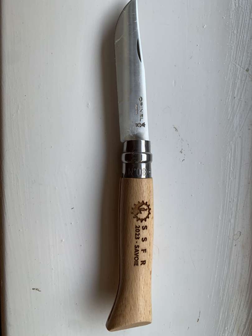 The small inox (stainless steel) lives in my gravel bike seat pack for picnic duties. The large No10 inox with a plastic handle is in my work tool kit, well my pocket mostly, and gets used multiple times a day.