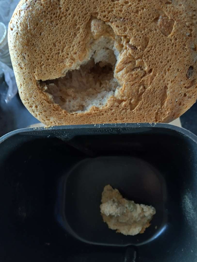 Uh oh. The bread has risen all the way up to the window, and I only did a L mix! This is a going to be a bruiser of a loaf. Toast for breakfast and sandwiches for lunch I think. Either it developed gluten really well or it's got a massive hole in the middle.