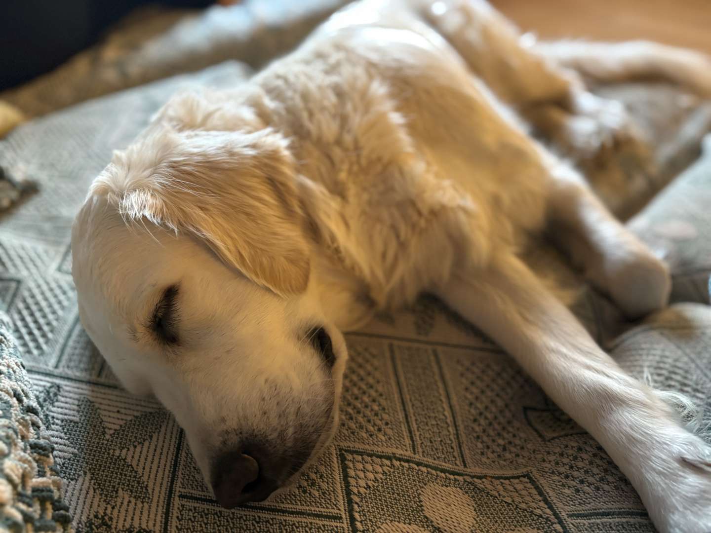 Hard work all this learning stuff. Five mins of “sit” with the clicker and treats, and she’s found her default happy tired place
