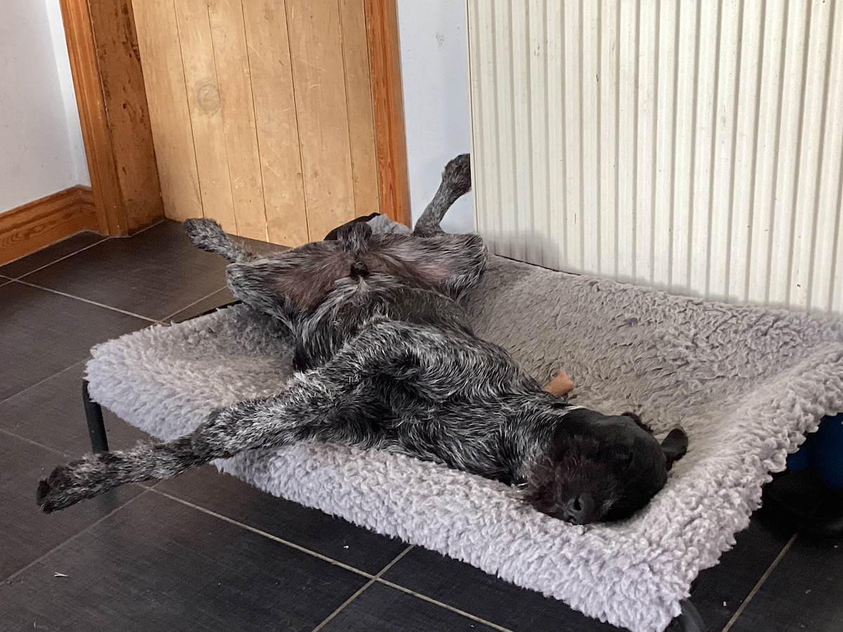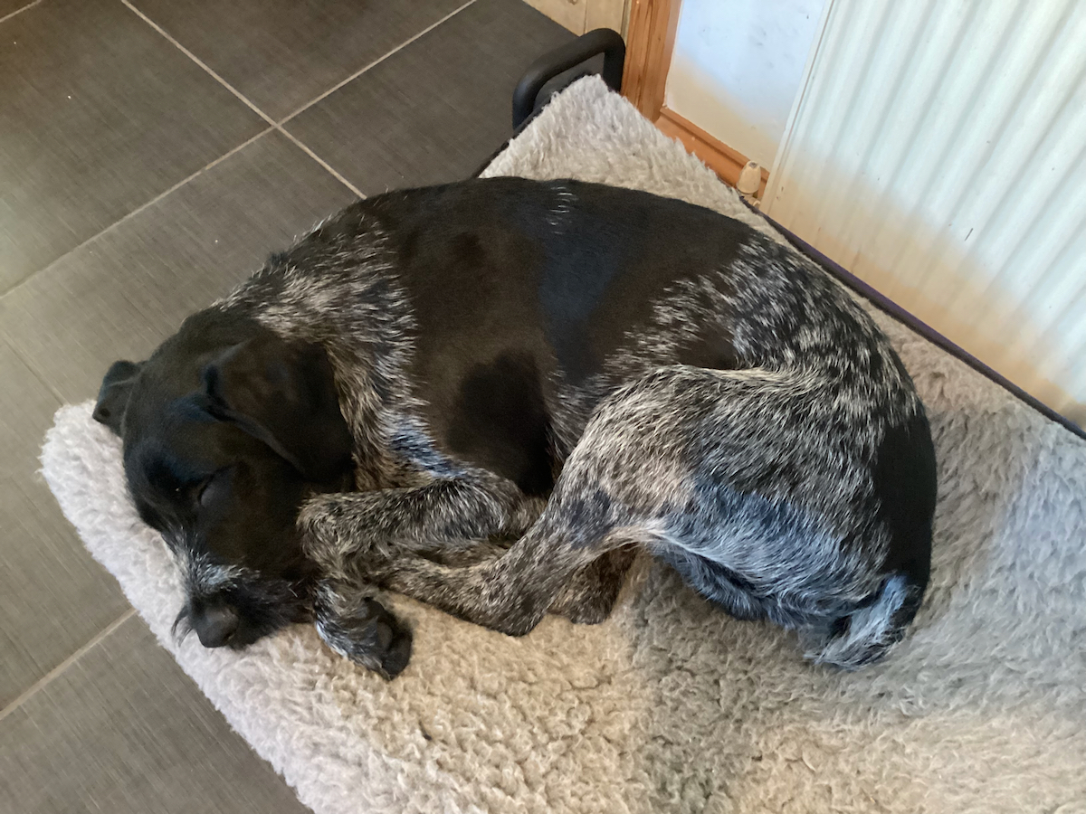 Lola (other Lola) would like it to be known that lying oddly is not a patented Pointer pose. This pure mongrel has been rocking it for 11 years now.