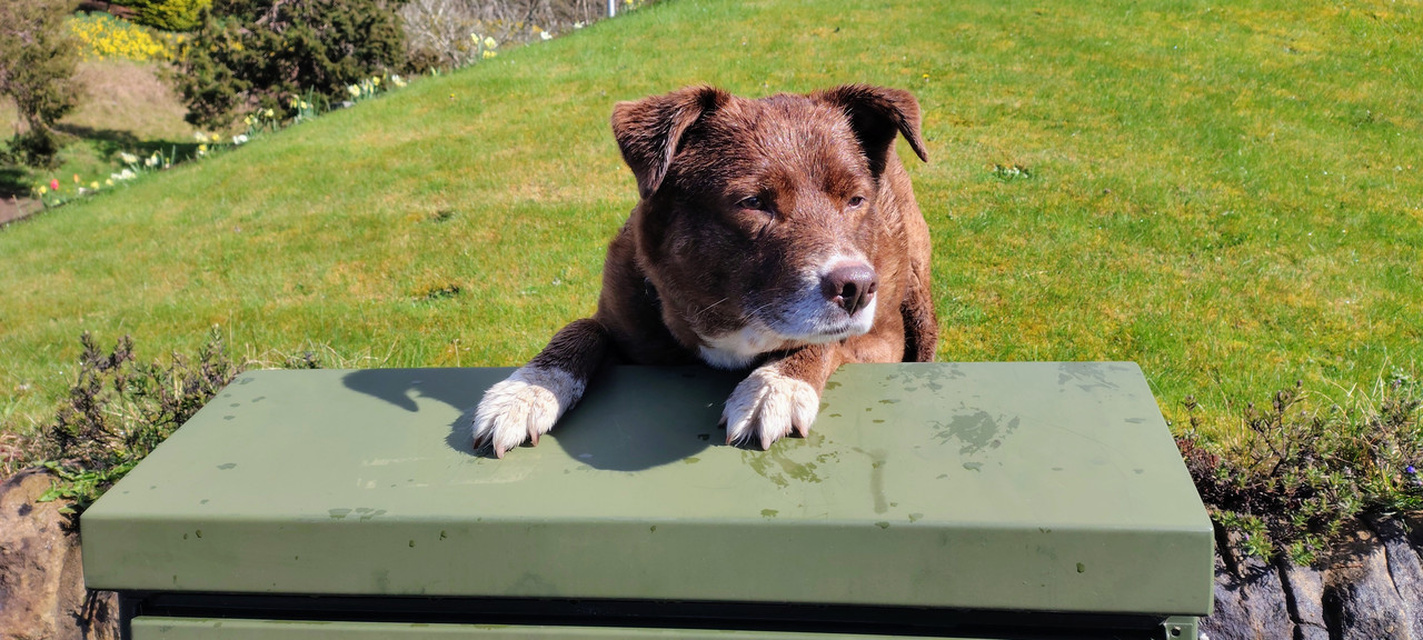 Lola doing her best to prove she's still a young pup. On top of her favourite kiosk for treats.