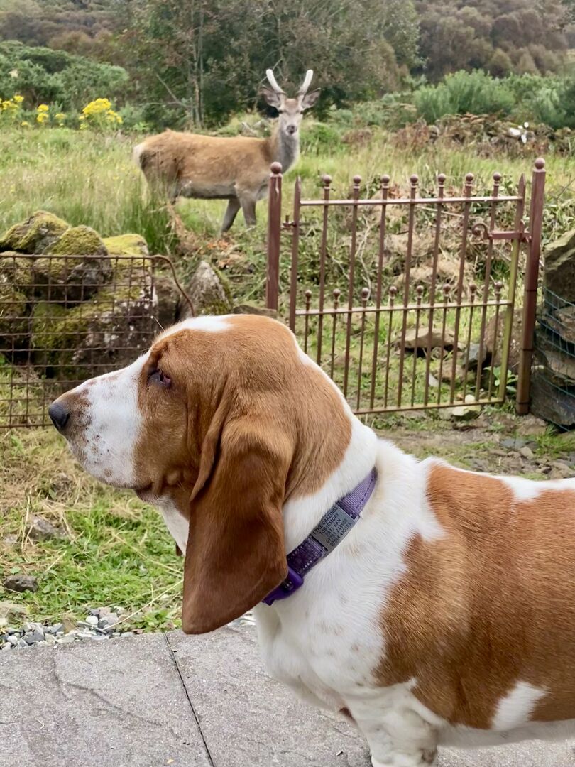 Dogs and deer can be a tricky combination. When living over in Moray, our other dog a Labrador with quite a strong prey drive would take off up the hill if they were in sniffing distance. Since we moved to Mull, we have a small herd of wild deer around us with a very dominant female - she'll stand her ground and kick at any dogs that get close. The dogs and deer now will quite happily stand a few feet apart, each minding their own business. Daisy will bark at any other dog of person that comes into view, but completely ignores the deer.