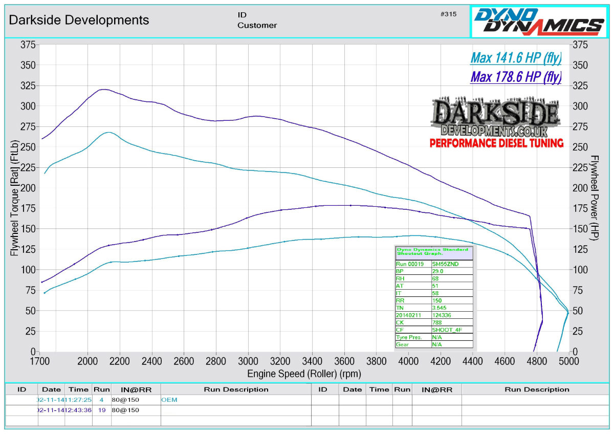 Similar story for power. Original = 156bhp @ ~3,200 rpm, remap = 208 bhp @ ~ 4,100 rpm.