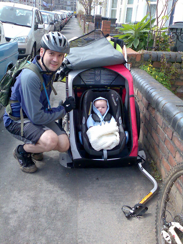 Ben's now 8 months and we started using it at 5 months, but he wouldn't have been able to use it without the dedicated sling which suspends from the internal frame. I'm also thinking of using it behind my MTB on fire roads as we're between Dalby and Sherwood pines. We currently use it on the quiet roads around the Lincs wolds. Cars give us a surprisingly wide berth and I've mounted a flashing red LED on the top right hand corner of the rear of the trailer and done away with the flag. (Image is everything even to a 5 month old!)