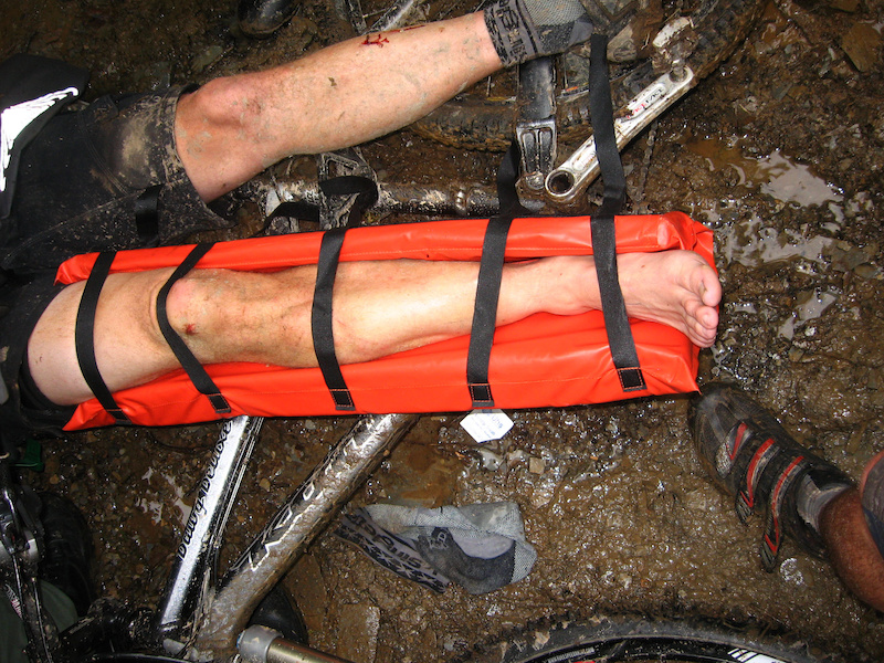 A few years back now on The Raven at Brechfa, my mate's broken tibia and fibula he had to reset it himself after the crash but after a couple of hours wait with the paramedics he eventually got a free ride in a big yellow helicopter and some metal work inserted into the bone courtesy of the NHS, into the bargain. Lot of fuss over nothing really ... no proper scars to show for it the worst of it was they had to cut off his Singletrack sock 😀