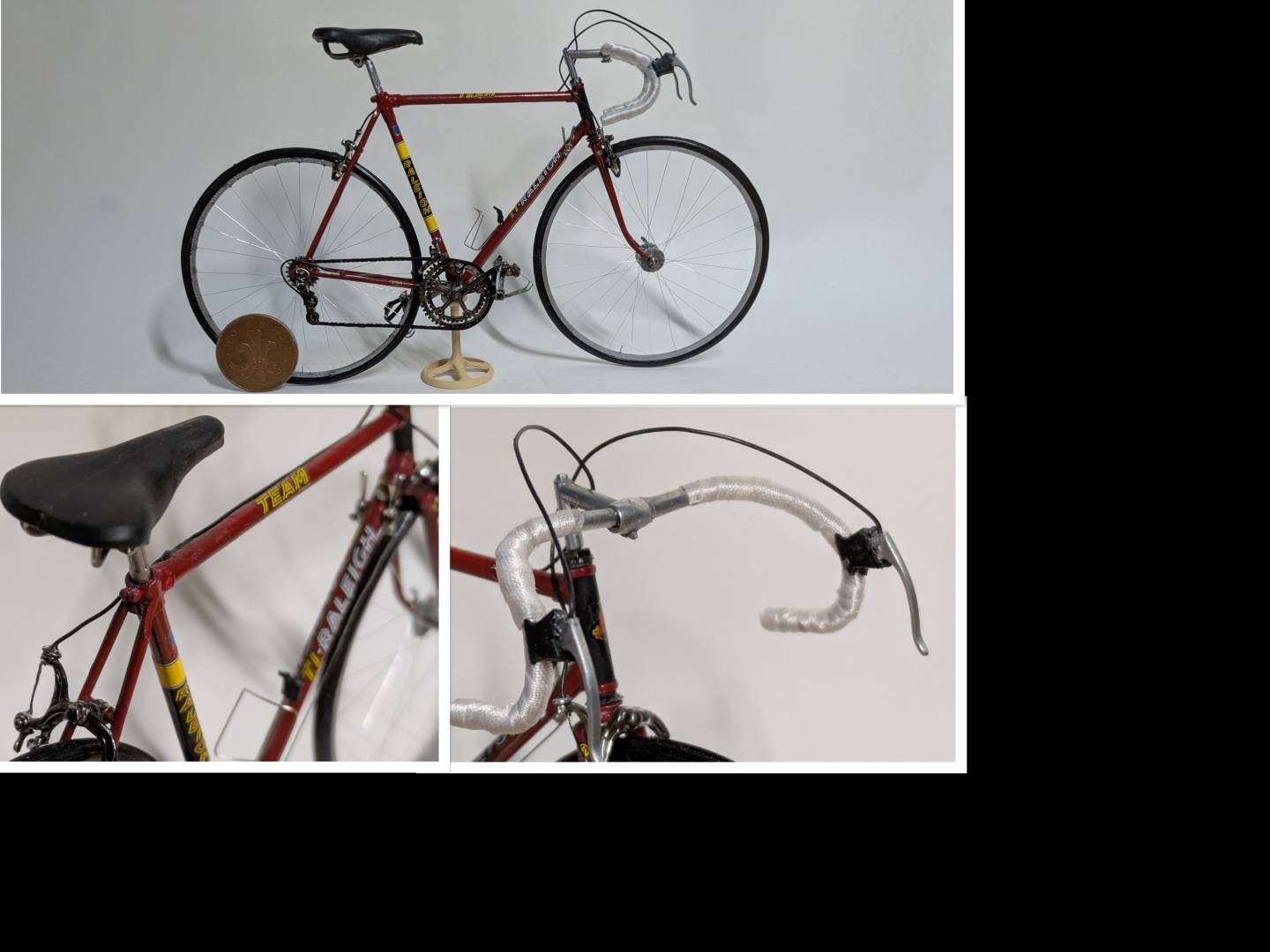Finished the 1/9 bike kit I found at a local auction (see above). I replaced the supplied wheels and bottle cage, and found some Tamiya 0.5mm diameter wire to replace that supplied for the cables, which would have scaled up to something like hosepipe. Just a bit delicate for the final assembly (the spokes are only 0.15mm diameter) so damaged them a bit.