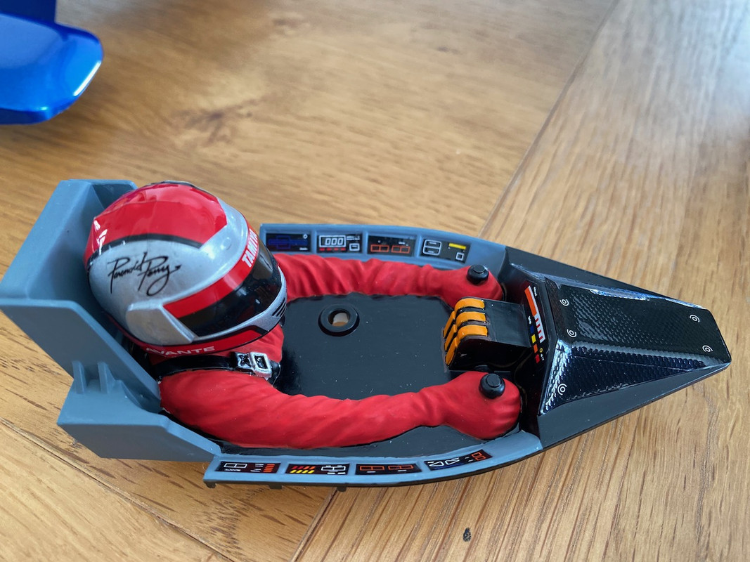 Very happy with the finish on the body (not that it shows very well in photos) - did it "properly" and backed the blue with silver. Decal on top of the drivers helmet is shocking but happy with him otherwise. Gearboxes and motor mounting done, suspension arms next.