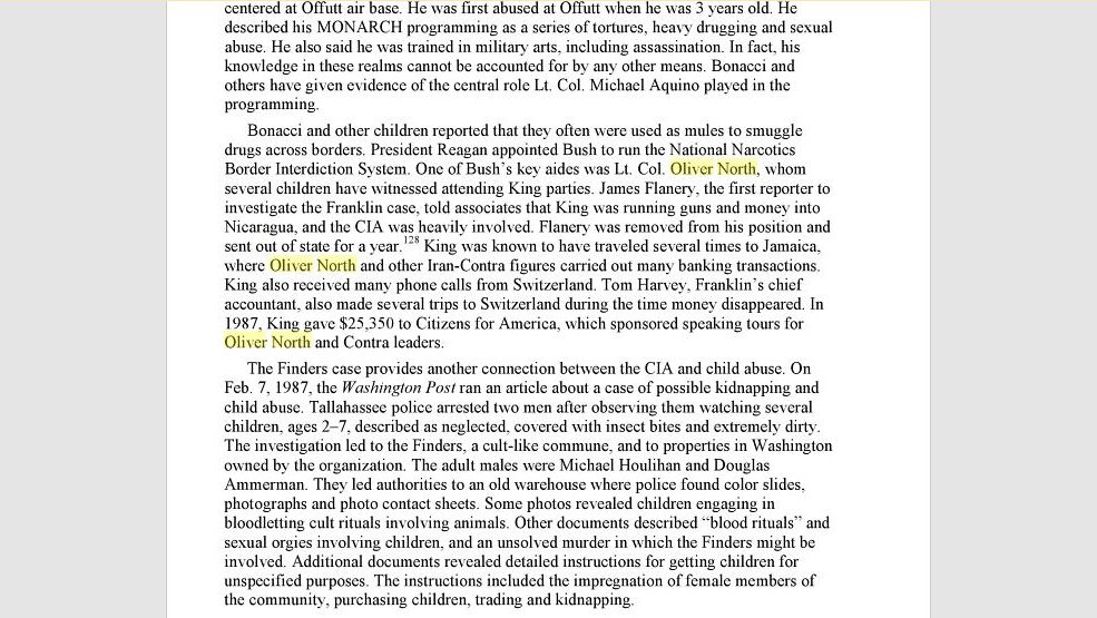Incredibly, not only have the Belgians that were involved in Iran Contra been accused of child abuse (Boas, Mathot, Vanden Boeynants and Beaurir), but North and his employer, vice president and later president George Bush, were uncomfortably close to the Franklin child abuse affair in the United States. Both were mentioned by witnesses as having attended the parties of alleged child abuser, Satanist, Contra supporter, money launderer and drug dealer Lawrence E. "Larry" King. [17] Another Contra supporter and alleged child abuser, Robert Keith Gray, was also close to Bush, North and King. [18]