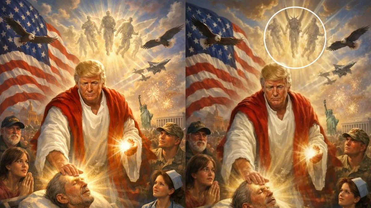 The original was a post a Maga account posted a couple of months ago (and was widely criticised for then too). The Whitehouse's reposted version has a weird alteration where they've added some sort of angel/demon mashup. Its not really clear if they've added wings or an additional pair of outstretched arms, and something obscures the face and then theres sort of either a crown or horns - but its pretty zany alteration to make into an already pretty unhinged image