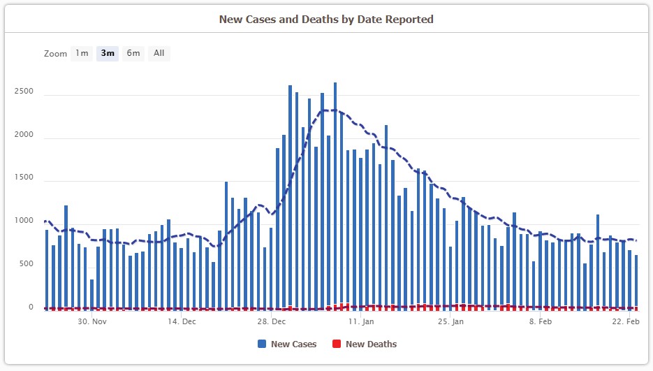 Cases aren’t really dropping just now – despite the restrictions and the vaccines – the average daily cases has been bouncing around 8-900 for the last 2 weeks at least.