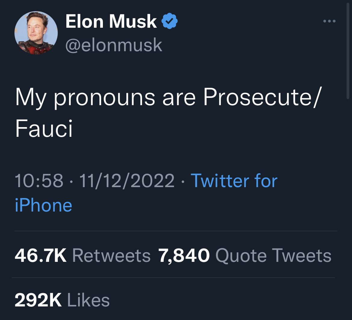 He does seems to have gone completely wild now. The pronouns thing is new level craziness for someone in his position if you want any chance of mainstream advertisers back