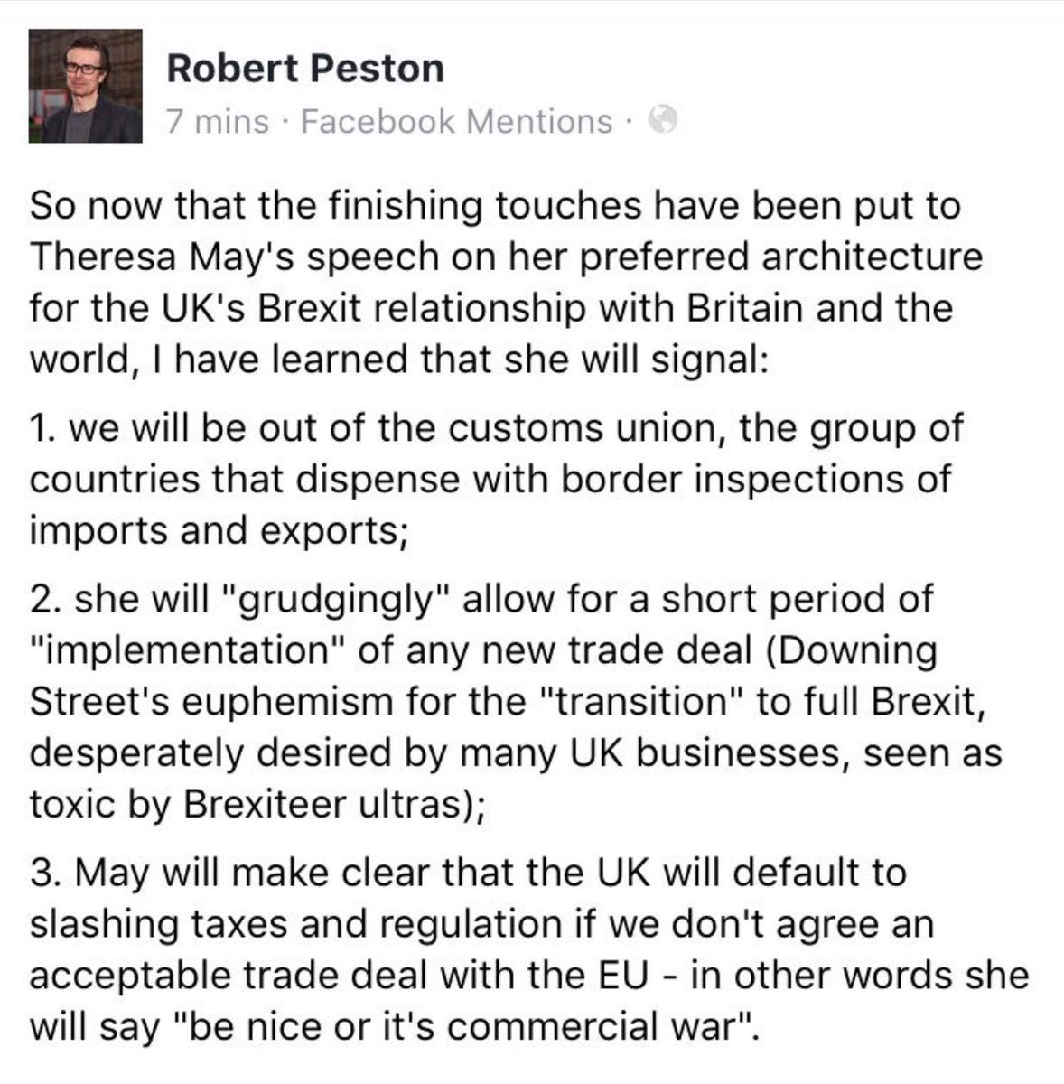 Good to see Peston's ego is in tact, "I have learned", there is an embargoed release to the press tonight of the main themes of the speech - the full details are on [url= https://order-order.com/2017/01/16/may-speech-pre-briefed-quotes/ ]Guido Fawkes[/url]