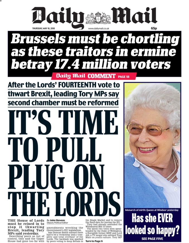 We're well and truly into 'you couldn't make it up' territory when it was Dave, lest we forget, who stuffed the Lords with Tory Peers who are now gleefully revelling in telling Theresa to eff off. For this they are rewarded by being labelled as Traitors and Enemies of the People by the headbangers., but I suspect are being cheered on by the less unhinged majority of Tory MP's