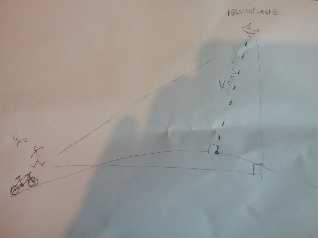 Using da power of siunse I reckon the spot that the plane would vertically over would be slightly closer dude the divergence between vertical for you and verticle for the plane. See my computer model render above