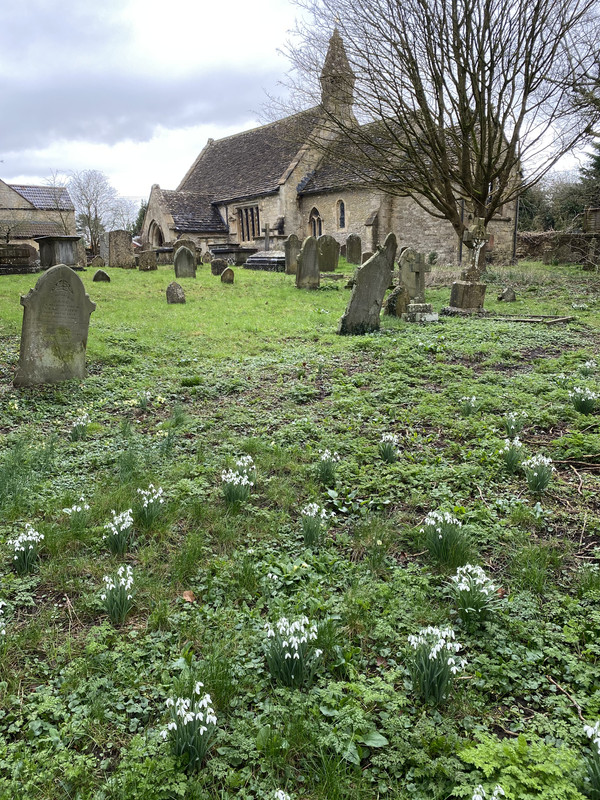 Snowdrops and primroses in Biddestone churchyard last Sunday, the primroses are centre-left, not so easy to see against the background, but there were surprising numbers out already.