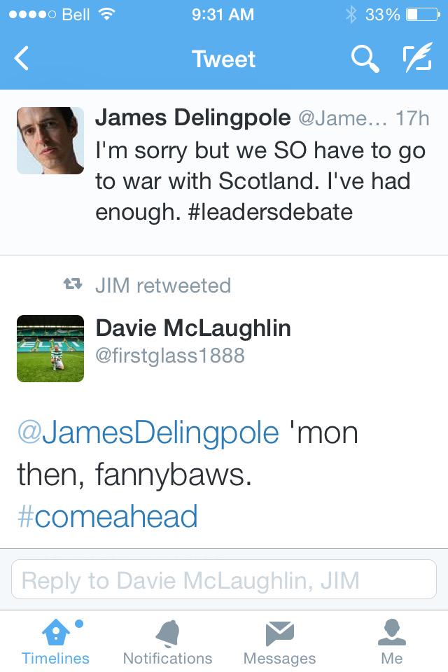 Right so the SNP do have a mandate in the rUK and the reverse side of that is that the Tories do have a mandate in Scotland, in fact more of a mandate with their one MP. So I guess sturgeon was talking nonsense [url= http://news.stv.tv/politics/268629-tories-to-debate-defence-as-sturgeon-accuses-cameron-of-being-feart/ ]here. [/url]