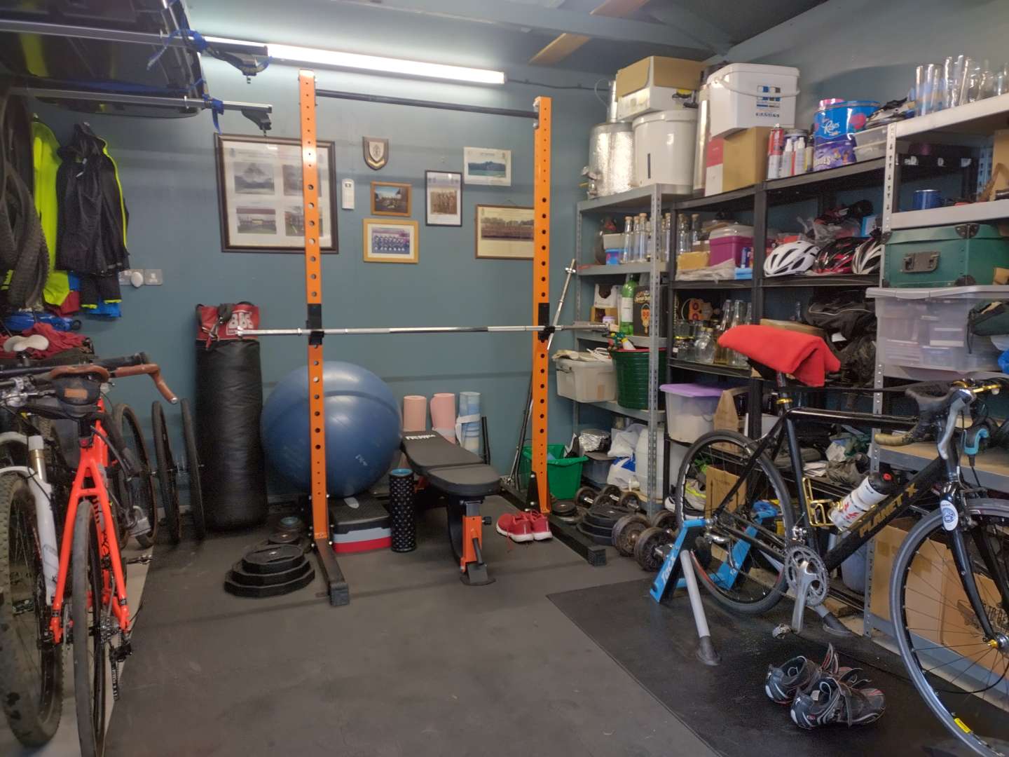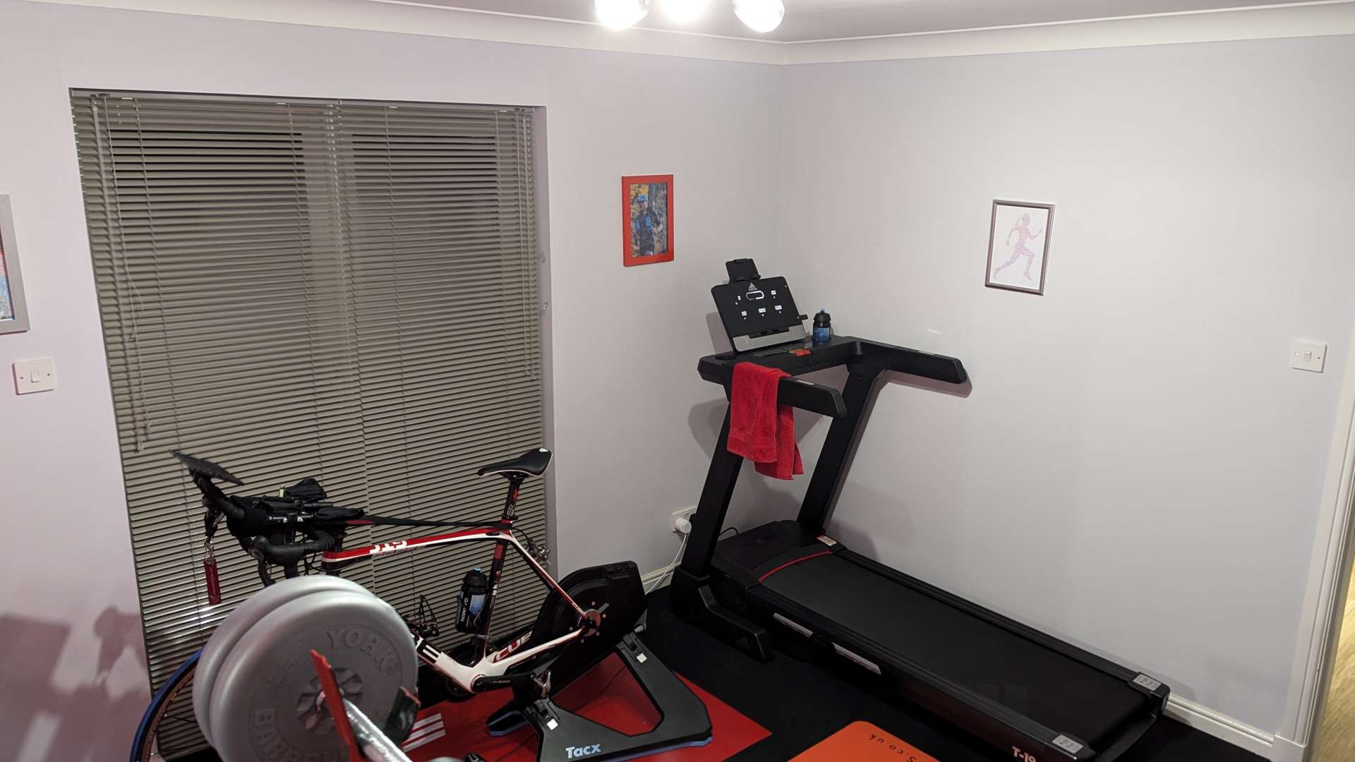 It's evolved over the last few years: Kickr Bike, Headwind fan and Dyson tower fan, Hex dumbbells, Barbell and wall mounted rack, Decathlon bench (hidden), chin up bars, resistance bands, old TV, old amp and speakers, carpet floor with just enough space for yoga mat.