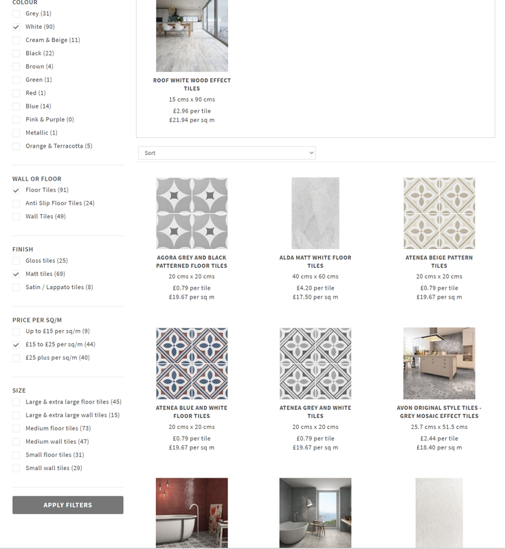You can't even tell what colour the tiles are or if they have flecks and pattern in from the picture on half the sites because they just show a tiles from the range so quite possibly in totally different colour to what you filtered on.