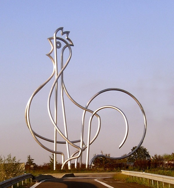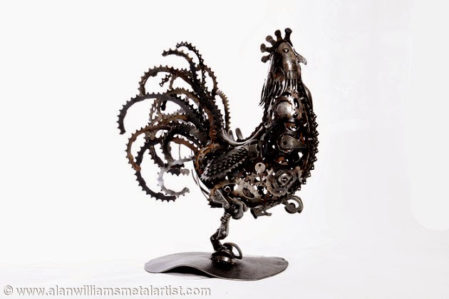 Play about the bits you've got until you start to spot shapes and interaction between shapes that describe something chicken-y. To do that kind of scrap-sculpture you need a lot of scrap to choose from. You also have to have a wide range of ideas in mind of what a chicken can look like - how anatomically correct or stylised it might be. Sometimes it poise or suggestions of movement that say 'chicken' more than detail