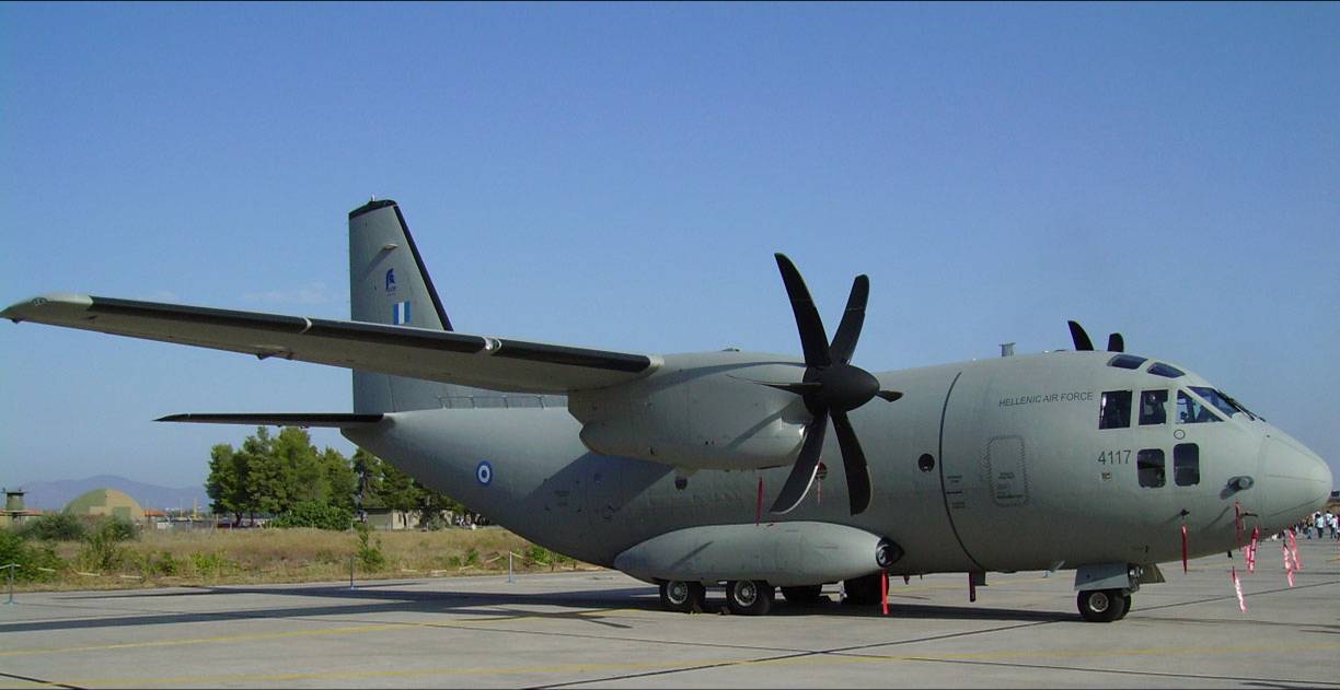 My guess would be the C-160, its tail looks disproportionately large compared to its fuselage, it's twin-prop, and they fly into the UK.