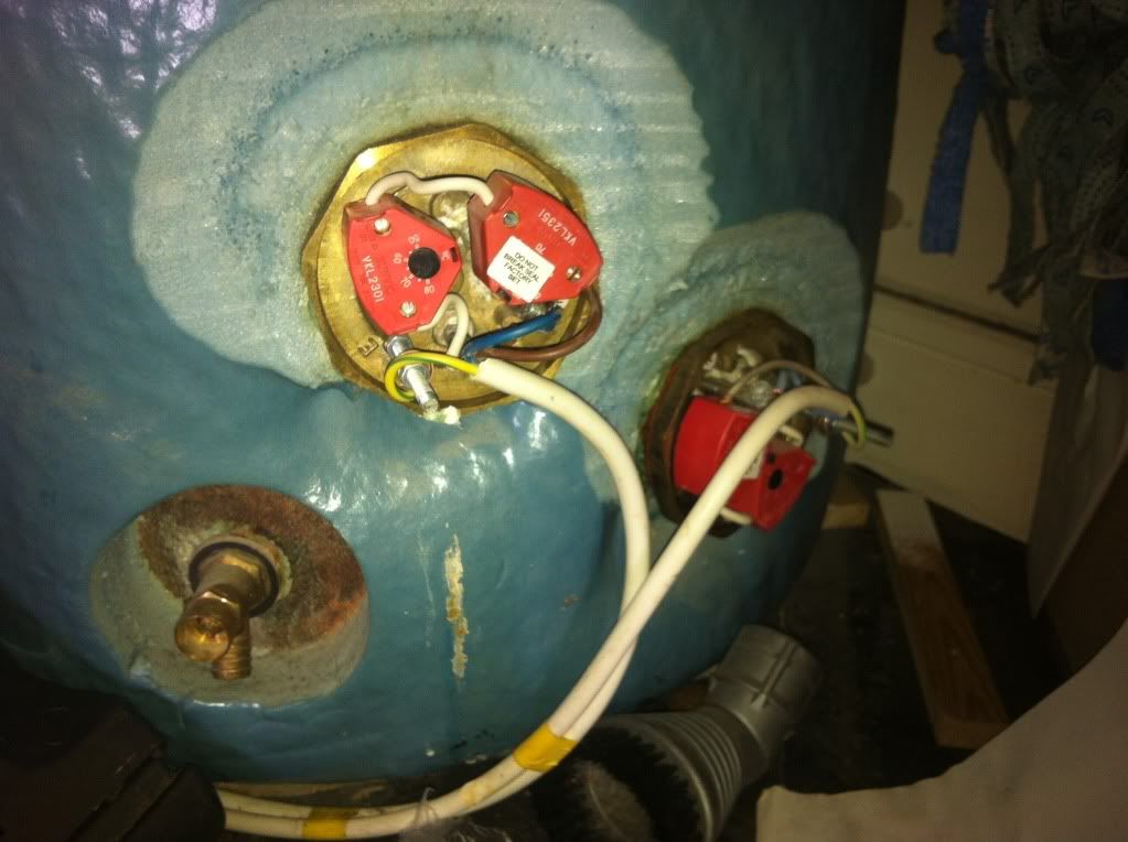 The element will be below both of these thermostats and you will just see two poles protruding from the brass of the immersion heater itself.