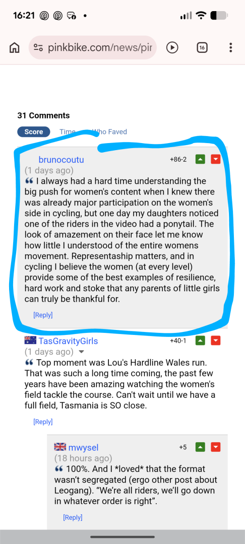 On a more positive note, Pinkbike has a good thread for Women's Day. Amazingly for that place, there contents are all pretty upbeat. This one stood out for me