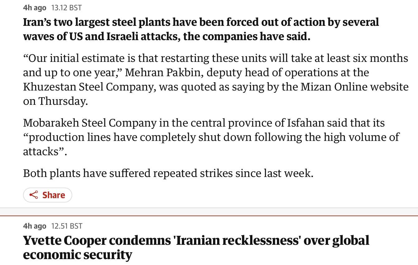 I think the difference here is that Netanyahu had a alternative outcome if the regime didn't collapse which was removing their ability to be a regional power. Which they've (to some extent at least) achieved. In that respect; it has been militarily successful. I think also we need to include the dead hand of MBS into the asshole category next to Trump and Netahyahu, while he's not directly involved, he's been cheering it on from the sidelines, and is fully behind the efforts to reduce Iran's influence and the raise the price of oil is a nice side-outcome*, and close the straights, all of which are clearly strategic gains for SA
