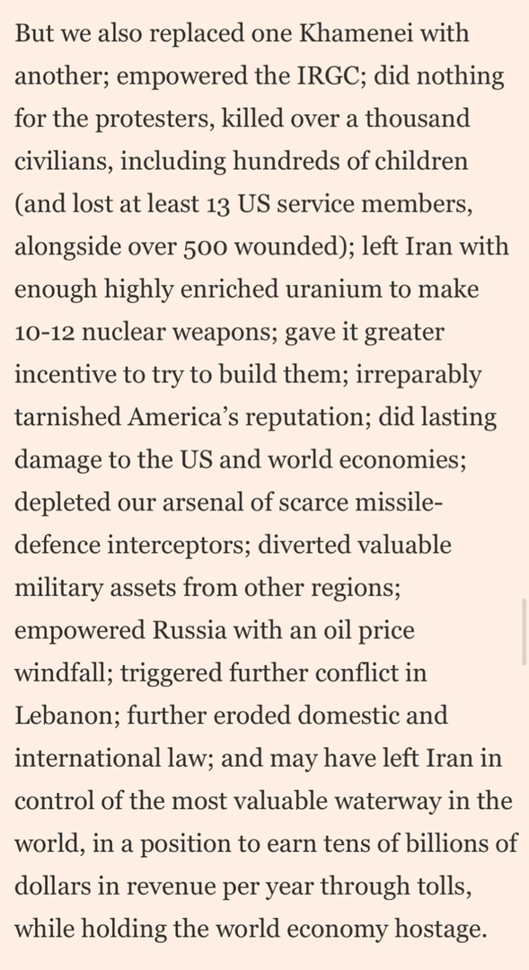 To you maybe. I acknowledged, and no one seems to be disagreeing that the Iranian regime are wrong uns. But they aren't the ones currently bombing schools, threating to "annihilate a civilisation", making billions off war related insider trading etc. etc.