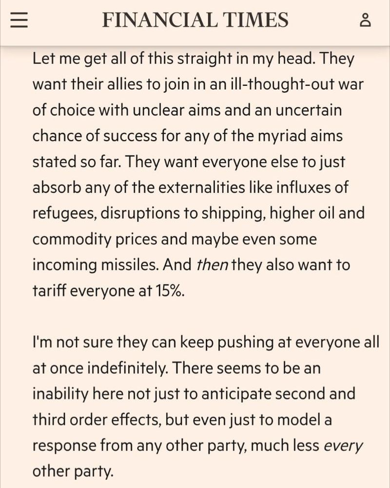 While I'm no fan of politicians dodging questions, the reality is they're dealing with a psychopath in the whitehouse, who's surrounded by even bigger psychopaths who will unleash ridiculous unhinged carnage on their allies at the drop of a hat if they feel aggrieved. It's a diplomatic minefield. I imagine a direct statement of no support for the US action would likely result in 50%+ tariffs on the UK the next day