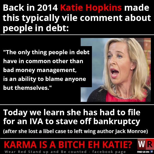 Controversial commentator Katie Hopkins, who once said poor people in debt have no one else to blame but themselves, has applied for an insolvency agreement in a bid to avoid bankruptcy following a costly libel case involving the food writer Jack Monroe