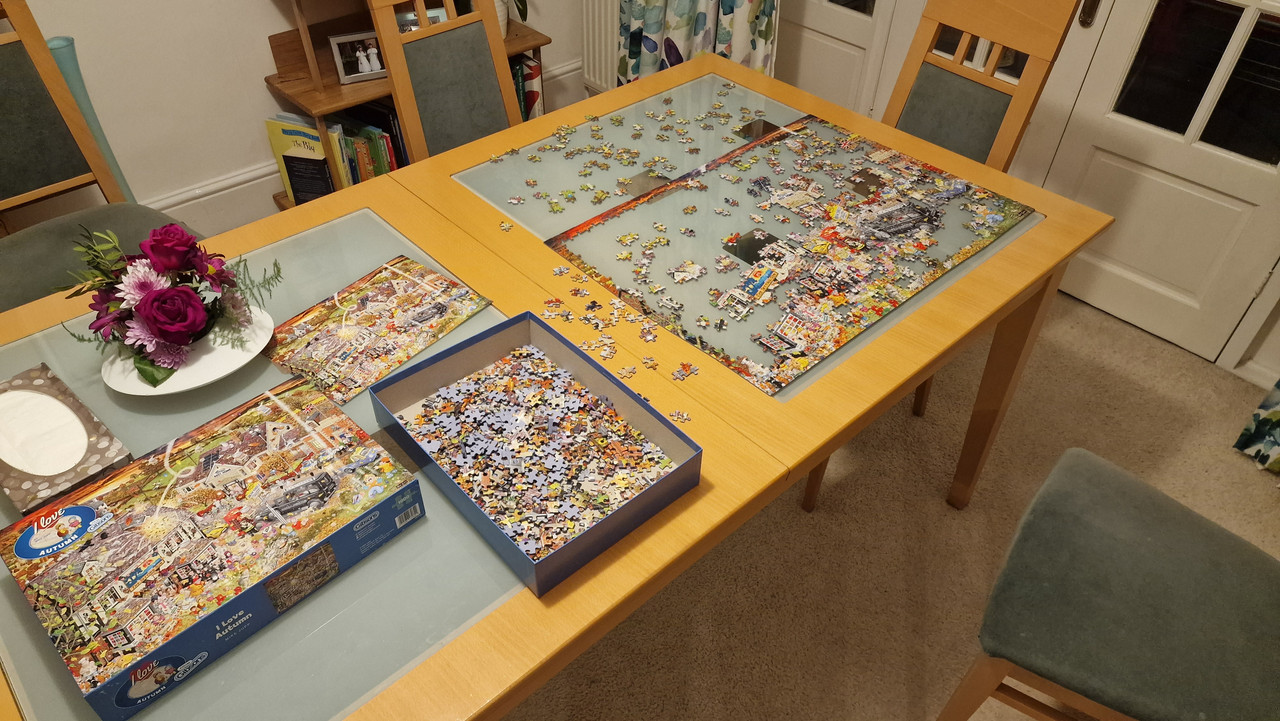 We've got a jigsaw board, that allows you to pack away the jigsaw if you need the table for something else before the puzzle is finished.