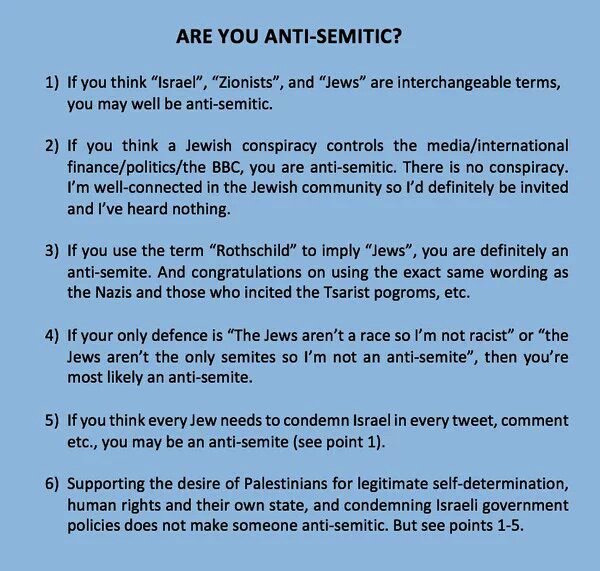 Thanks mefty. So Naz Shah and Ken Livinsgtone are not anti-semitic, since only point 6 applies to them.