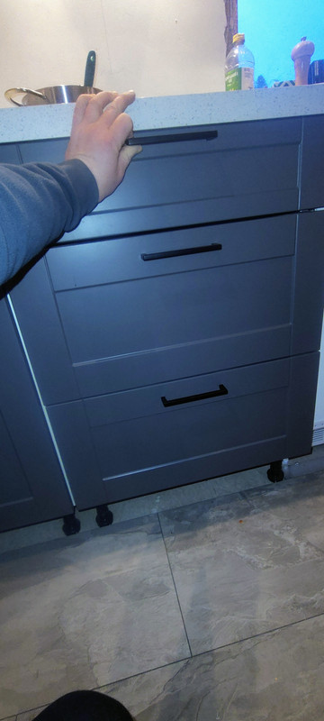 The top rail of the top drawer is narrows so if i split the difference and put the handle halfway down the toprail its very close to the worktop and the hob and looks a bit shit.