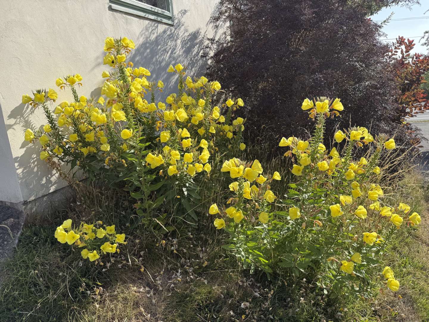 Apart from the ones above we have an escallonia shrub that is in flower at the moment, various honeysuckles and the Japanese anemones are just flowering. The flowers and grasses in our un-cut grass are very popular with insects including self heal, rough hawkbit and the magnificent self-set evening primrose below. The flowers on the un-cut privet too,