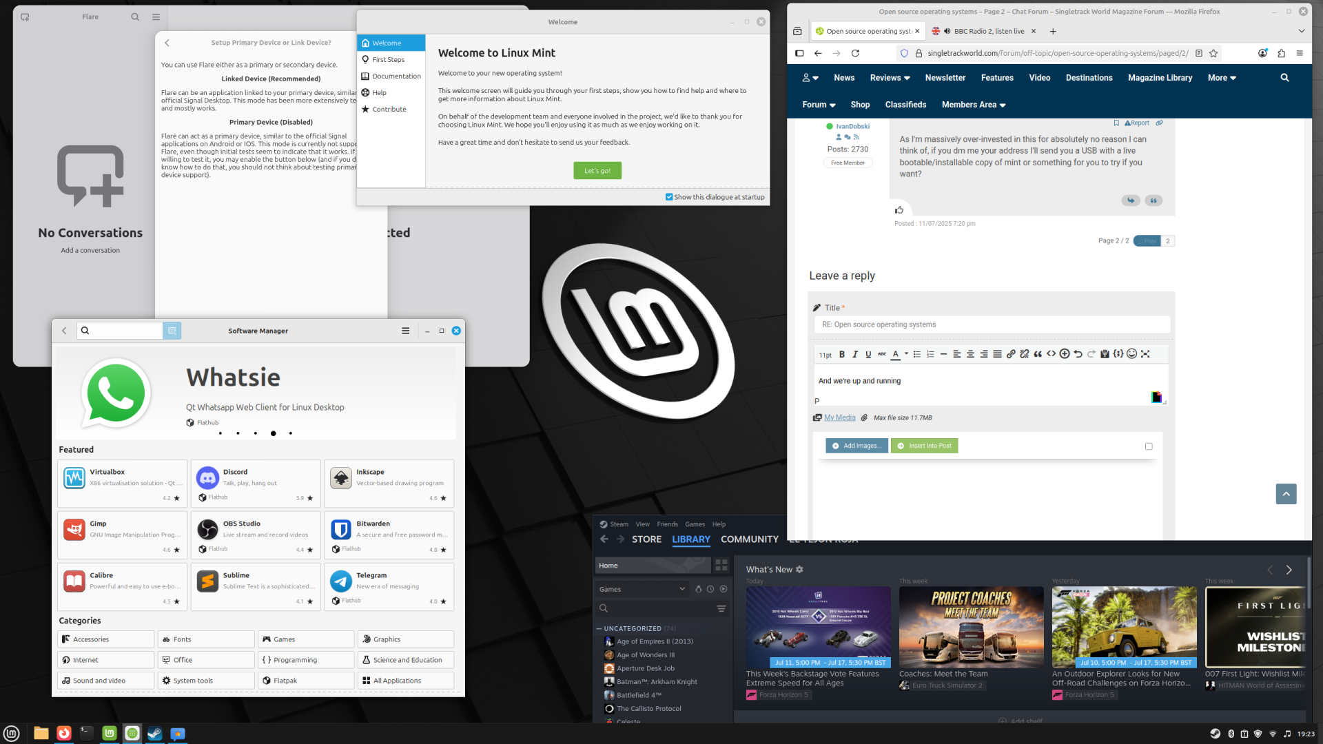 STeam, Whatsapp and signal aren't pre-bundled, but if you open the 'software manager' app, there are clients for both you can download.