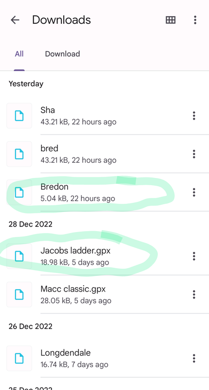 You can see in my Downloads folder on the phone that some of the files do not have .gpx following them and some do.