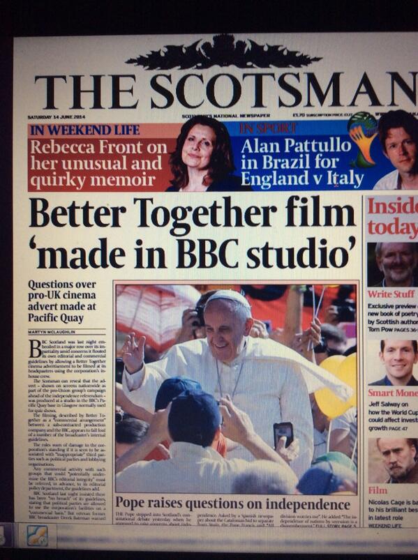 As far as the Scotsman's article is concerned I can't see much of a problem with that either, apparently : "There has been no breach of editorial guidelines as BBC facilities are made available to organisations and businesses who want to use them, including political parties, on a commercial basis". Which seems reasonable to me. I'm sure that if any breaches have been made the BBC will be held accountable, Yes Scotland will make sure of that no doubt.