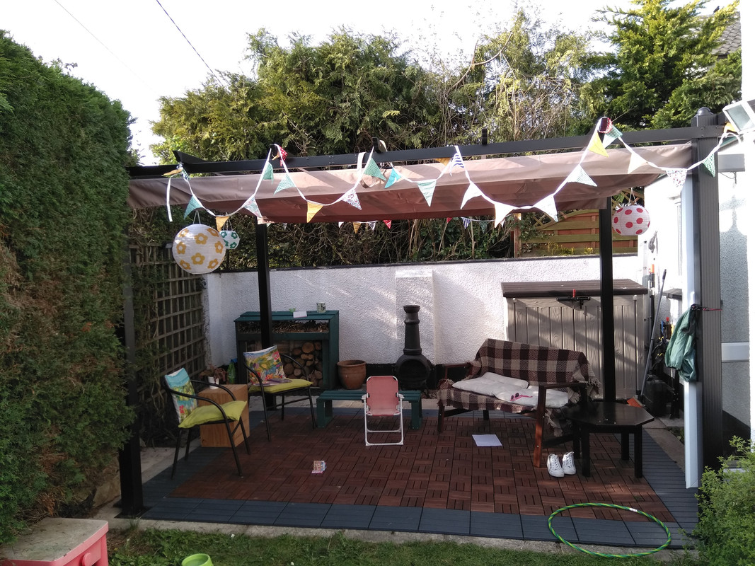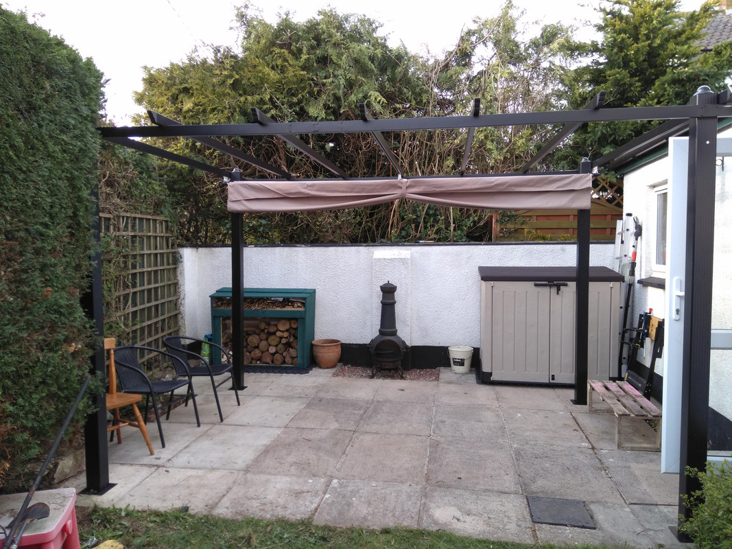 I did up our side patio a couple of years ago, and didn't want a permanent cover, but also needed shade in the sun (it's SW facing). Area is about 5m x 4m