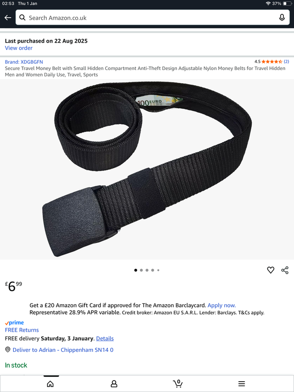I’ve got several webbing belts made by a company called Eagle Creek, which have a zip sewn on the back that allows a few folded notes of whatever currency you need to carry, and which I’ve worn for years. Unfortunately the plastic buckle can sometimes snap off the pins that act as a hinge, and similar ones are very difficult to find.