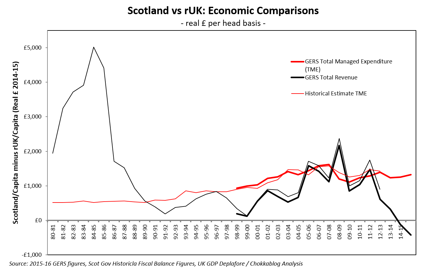 is a picture from Chokkablog that shows by his calculation that oil money flowing from Scotland to the to the UK (black line above red line) has to a significant extent come back to Scotland (red line above black line).
