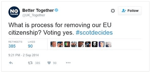 In fact, most people I know who voted 'No' in 2014 did so precisely because they didn't want to leave the EU - and the government of the time was pushing this kind of thing: