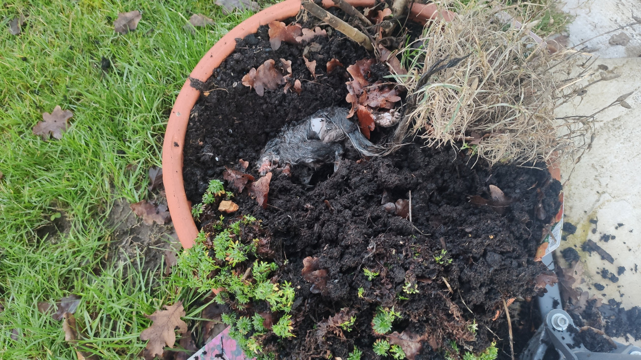 Clearly thrilled with out wildlife management it has just dug out a flowerpot and left us a squirrel