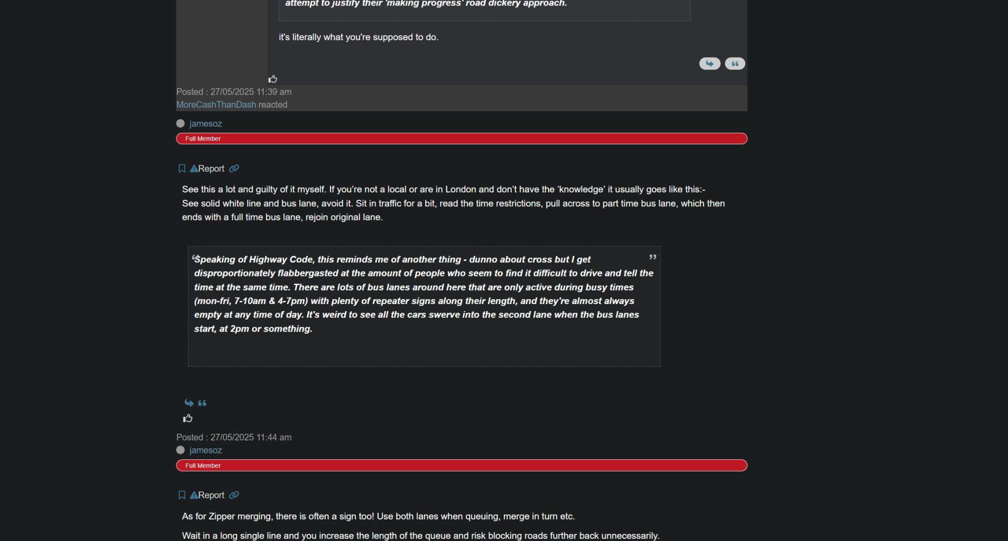 Speaking of Highway Code, this reminds me of another thing - dunno about cross but I get disproportionately flabbergasted at the amount of people who seem to find it difficult to drive and tell the time at the same time. There are lots of bus lanes around here that are only active during busy times (mon-fri, 7-10am & 4-7pm) with plenty of repeater signs along their length, and they're almost always empty at any time of day. It's weird to see all the cars swerve into the second lane when the bus lanes start, at 2pm or something.