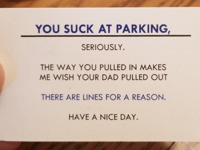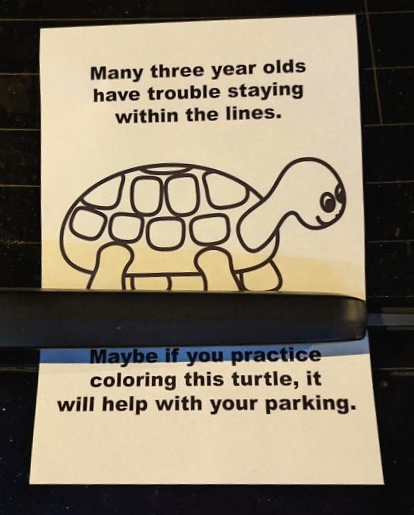 For the drivers with zero spacial awareness, and who enjoy taking up two parking spaces, I think I’ll get some of these printed up…