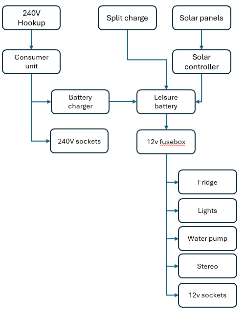 Our set up was (it started with split charge and a leisure battery, then I progressively added hookup and solar):