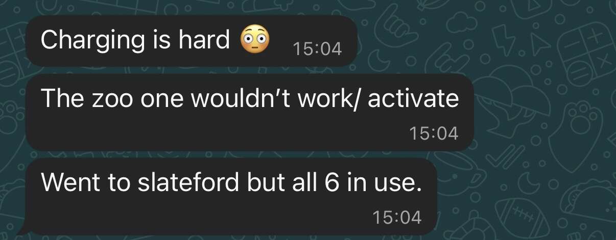We don’t charge away from home or work very often, messages from the wife yesterday show that the charging infrastructure still needs work…